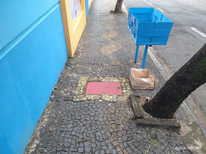 Sem falar na gincana que se torna usar o guarda-chuva em calçadas estreitas assim. É preciso levantar, abaixar e manusear o objeto para desviar de lixeiras, postes, placas, árvores, pontos de ônibus, o que torna a caminhada ainda mais desprazerosa.